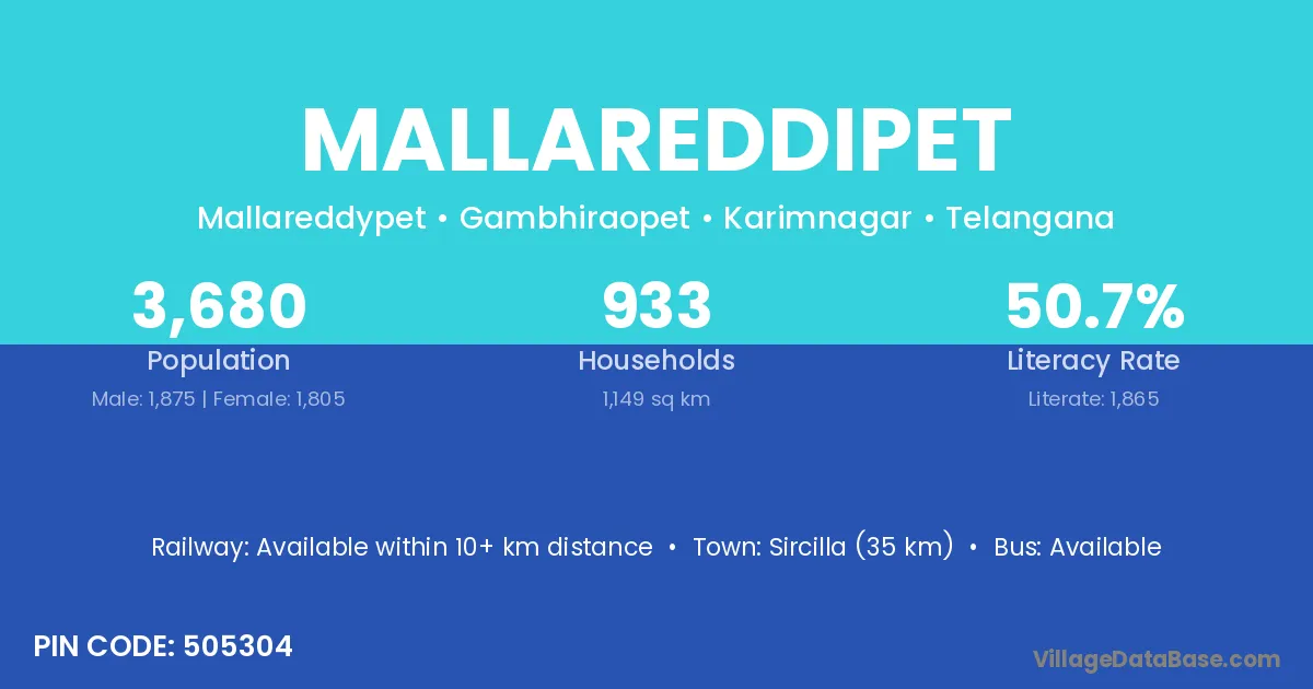 Sircilla (35 km) is the nearest town to Mallareddipet village for major economic activities and is located approximately 35 km away.