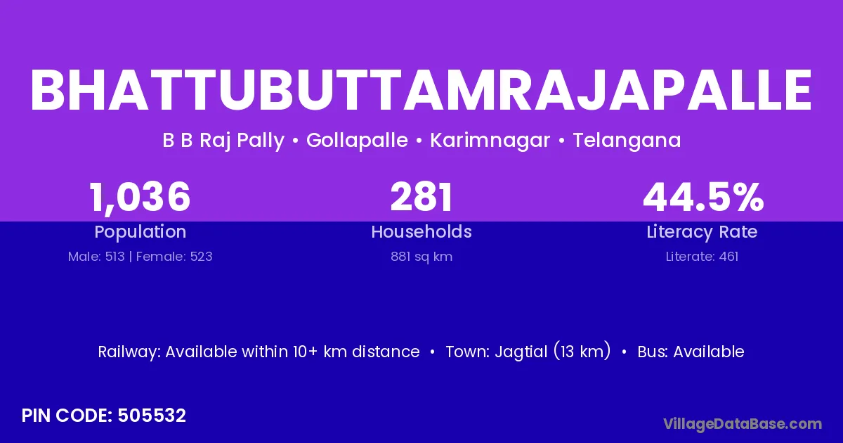 Jagtial (13 km) is the nearest town to Bhattubuttamrajapalle village for major economic activities and is located approximately 13 km away.