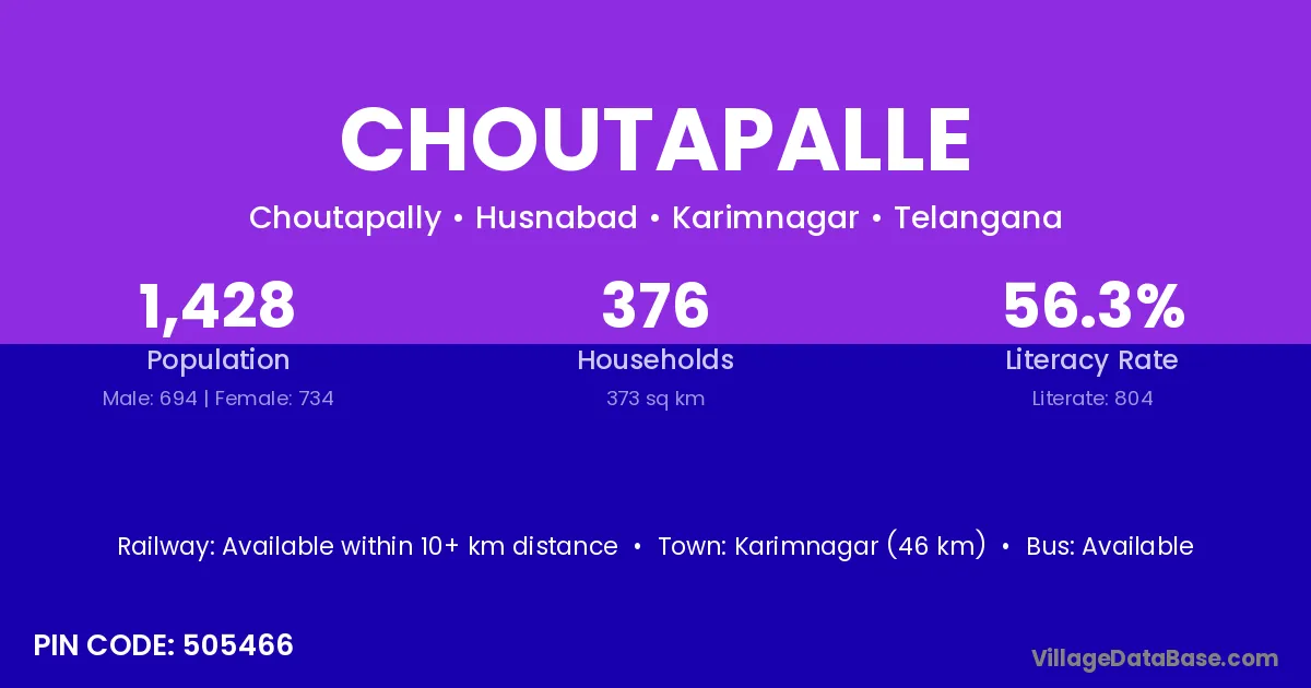Karimnagar (46 km) is the nearest town to Choutapalle village for major economic activities and is located approximately 46 km away.
