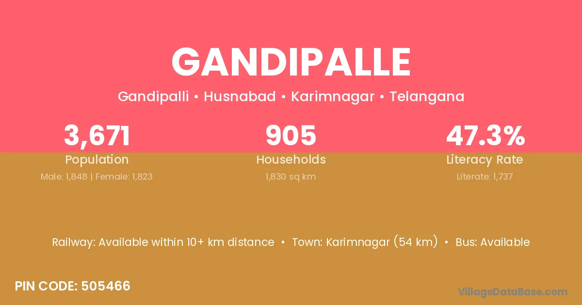 Karimnagar (54 km) is the nearest town to Gandipalle village for major economic activities and is located approximately 54 km away.