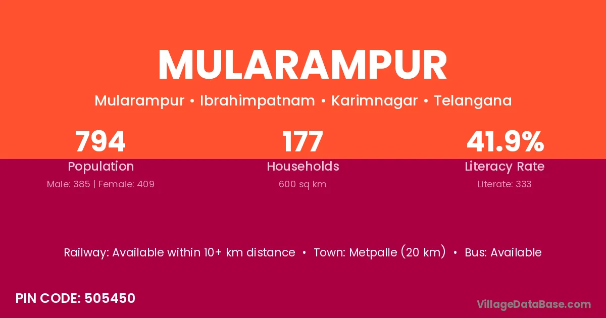 Metpalle (20 km) is the nearest town to Mularampur village for major economic activities and is located approximately 20 km away.