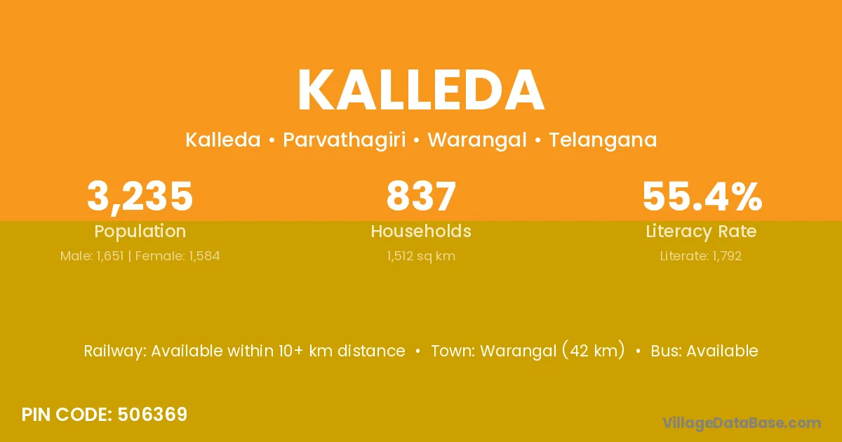 According to Census 2011 information, the village code of Kalleda village is 505454.