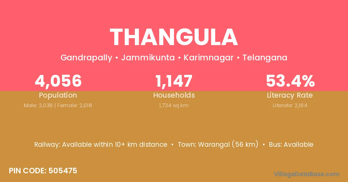 Warangal (56 km) is the nearest town to Thangula village for major economic activities and is located approximately 56 km away.