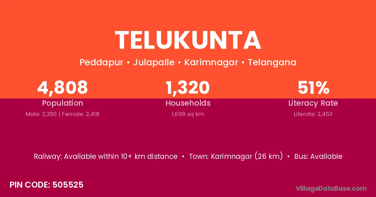 Karimnagar (26 km) is the nearest town to Telukunta village for major economic activities and is located approximately 26 km away.