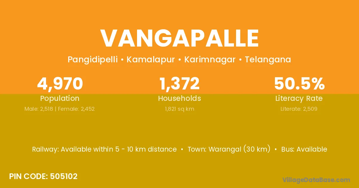 Warangal (30 km) is the nearest town to Vangapalle village for major economic activities and is located approximately 30 km away.