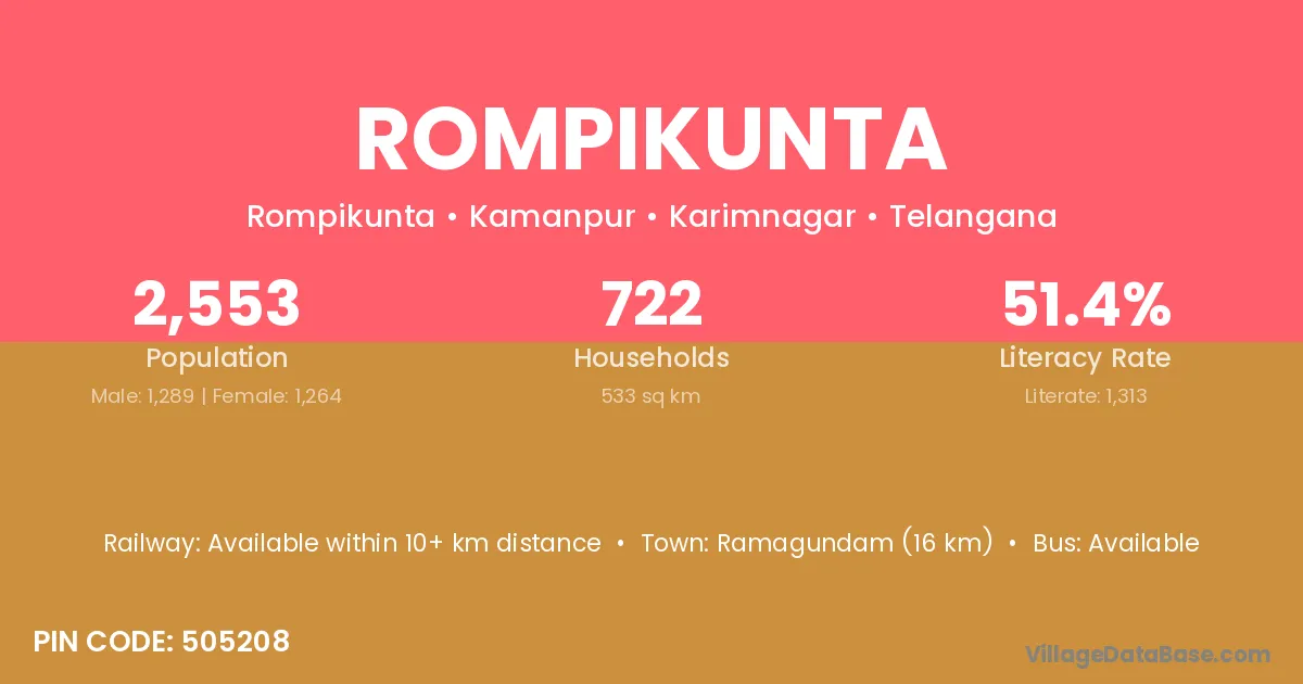 Ramagundam (16 km) is the nearest town to Rompikunta village for major economic activities and is located approximately 16 km away.