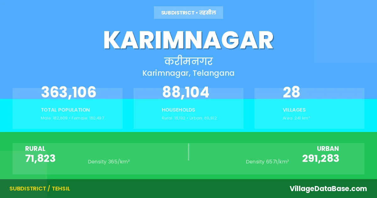 According to the 2011 census The total area of Karimnagar Mandal is 241 km², with a population of 363106 people. The population density is 1,505 inhabitants per square kilometre, and there are approximately 88104 houses in the sub district.