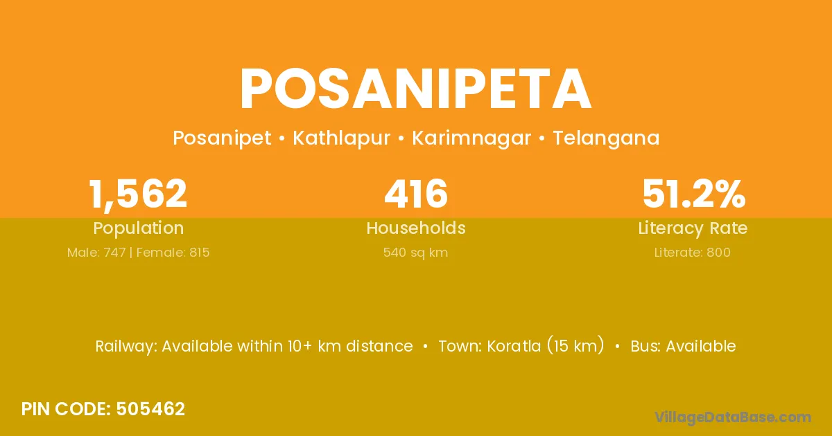 Koratla (15 km) is the nearest town to Posanipeta village for major economic activities and is located approximately 15 km away.