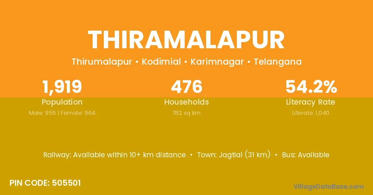 Jagtial (31 km) is the nearest town to Thiramalapur village for major economic activities and is located approximately 31 km away.