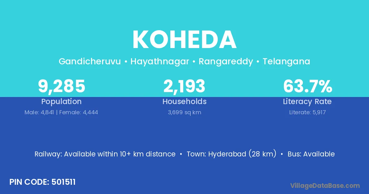 Karimnagar (37 km) is the nearest town to Koheda village for major economic activities and is located approximately 37 km away.