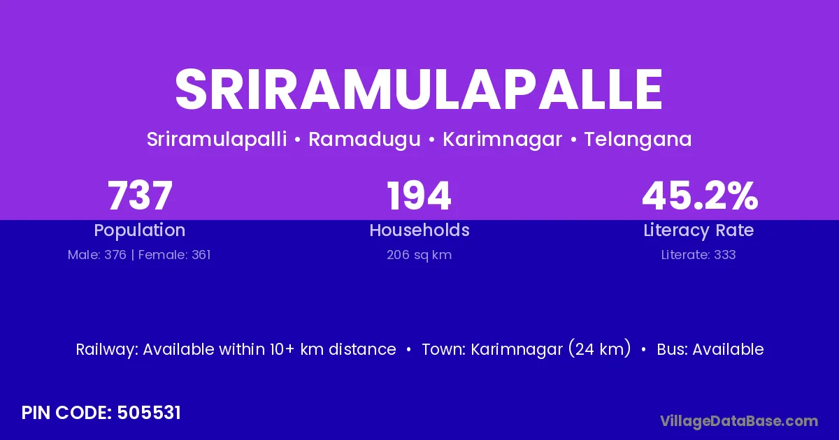 Karimnagar (41 km) is the nearest town to Sriramulapalle village for major economic activities and is located approximately 41 km away.
