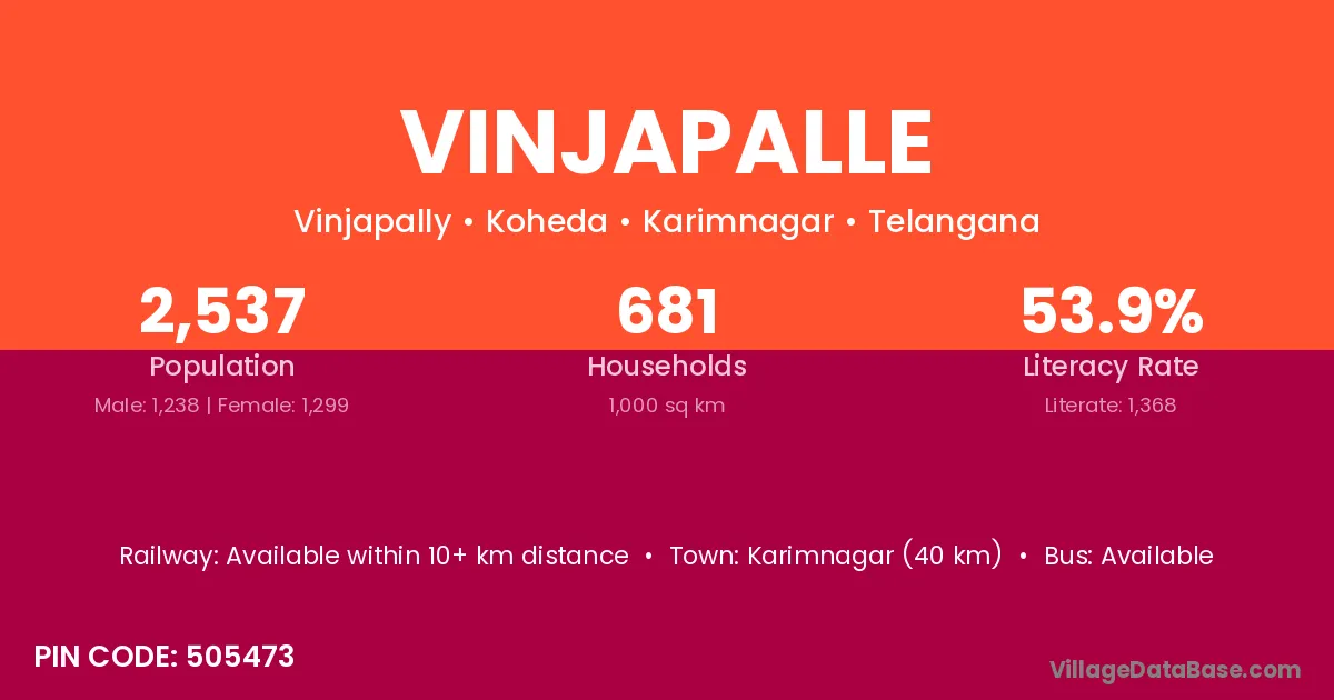 Karimnagar (40 km) is the nearest town to Vinjapalle village for major economic activities and is located approximately 40 km away.