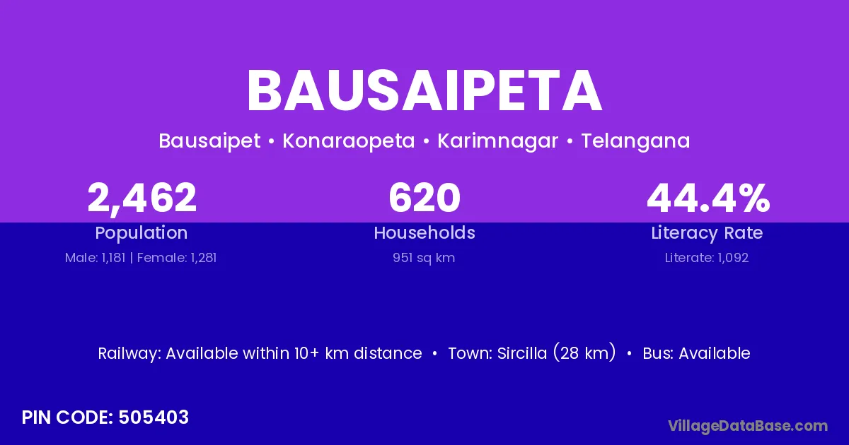 Sircilla (28 km) is the nearest town to Bausaipeta village for major economic activities and is located approximately 28 km away.