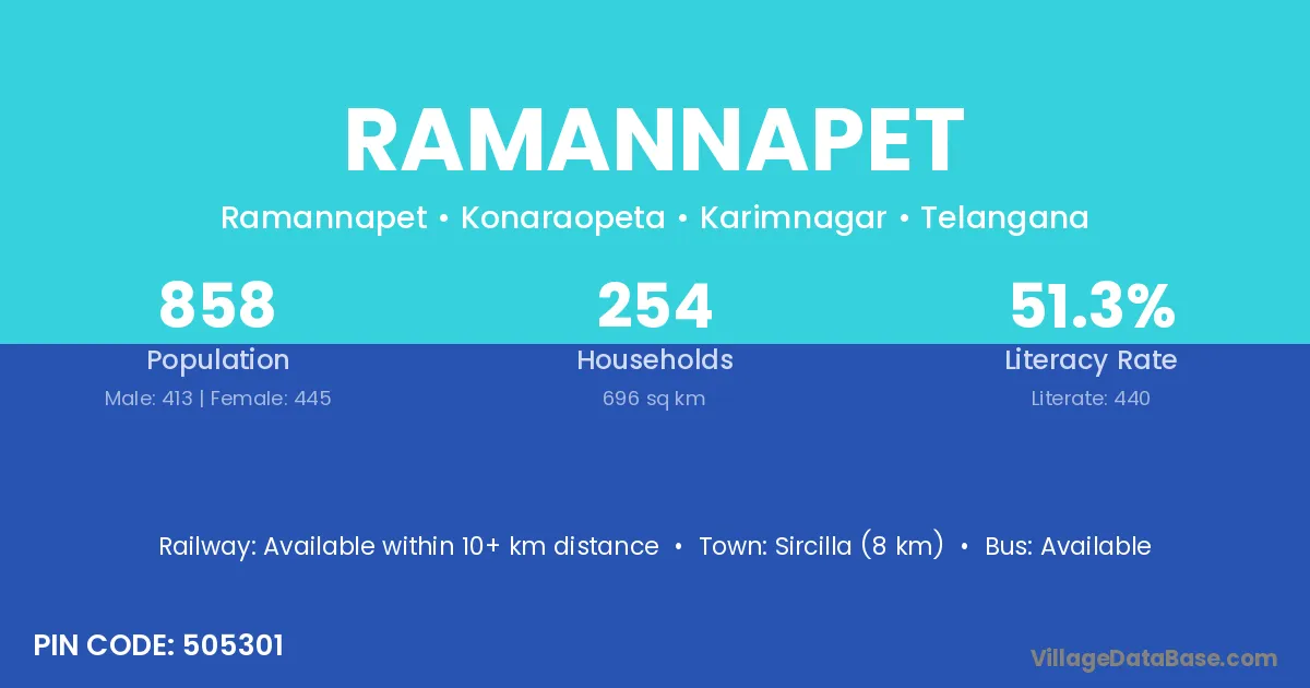 Sircilla (8 km) is the nearest town to Ramannapet village for major economic activities and is located approximately 8 km away.