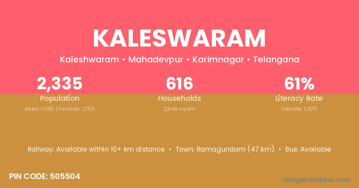 Ramagundam (47 km) is the nearest town to Kaleswaram village for major economic activities and is located approximately 47 km away.