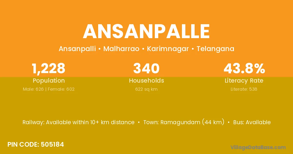 Ramagundam (44 km) is the nearest town to Ansanpalle village for major economic activities and is located approximately 44 km away.