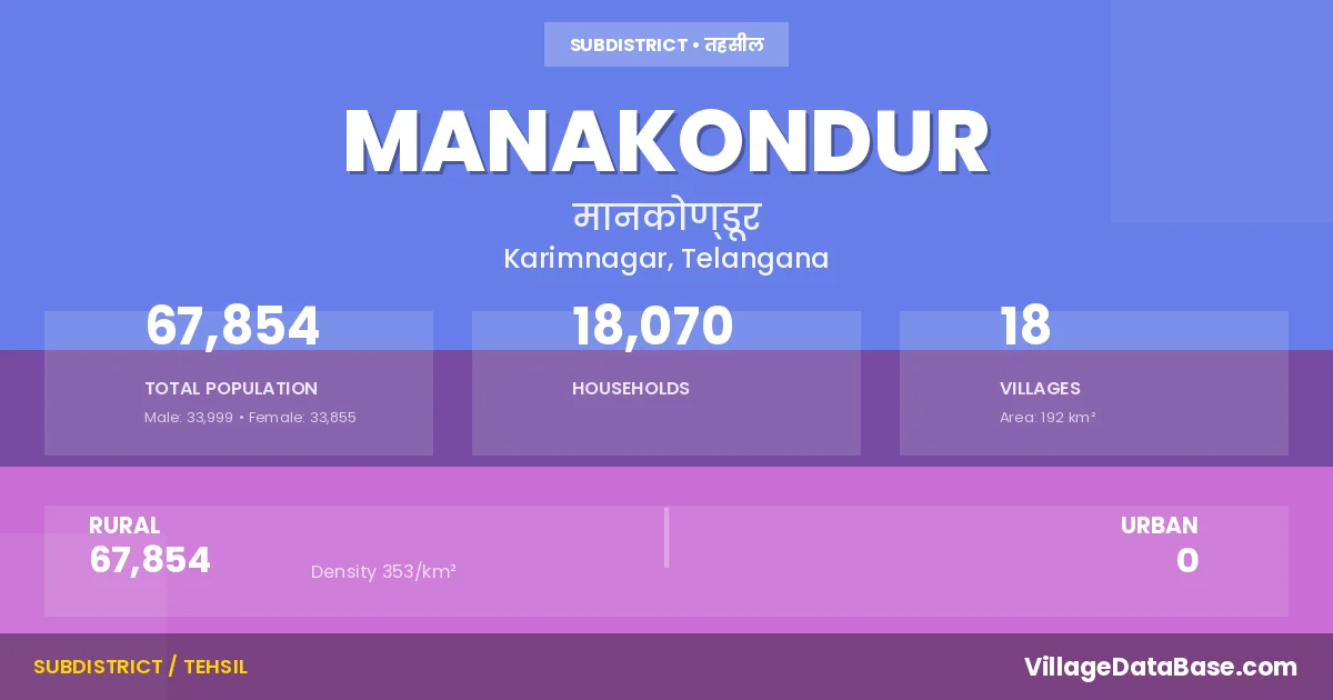 According to the 2011 census The total area of Manakondur Mandal is 192 km², with a population of 67854 people. The population density is 353 inhabitants per square kilometre, and there are approximately 18070 houses in the sub district.