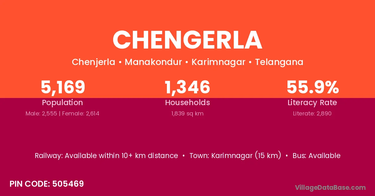 Karimnagar (15 km) is the nearest town to Chengerla village for major economic activities and is located approximately 15 km away.