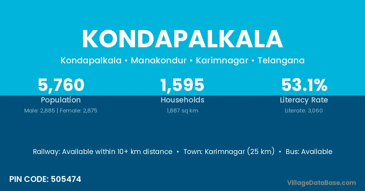 Karimnagar (25 km) is the nearest town to Kondapalkala village for major economic activities and is located approximately 25 km away.