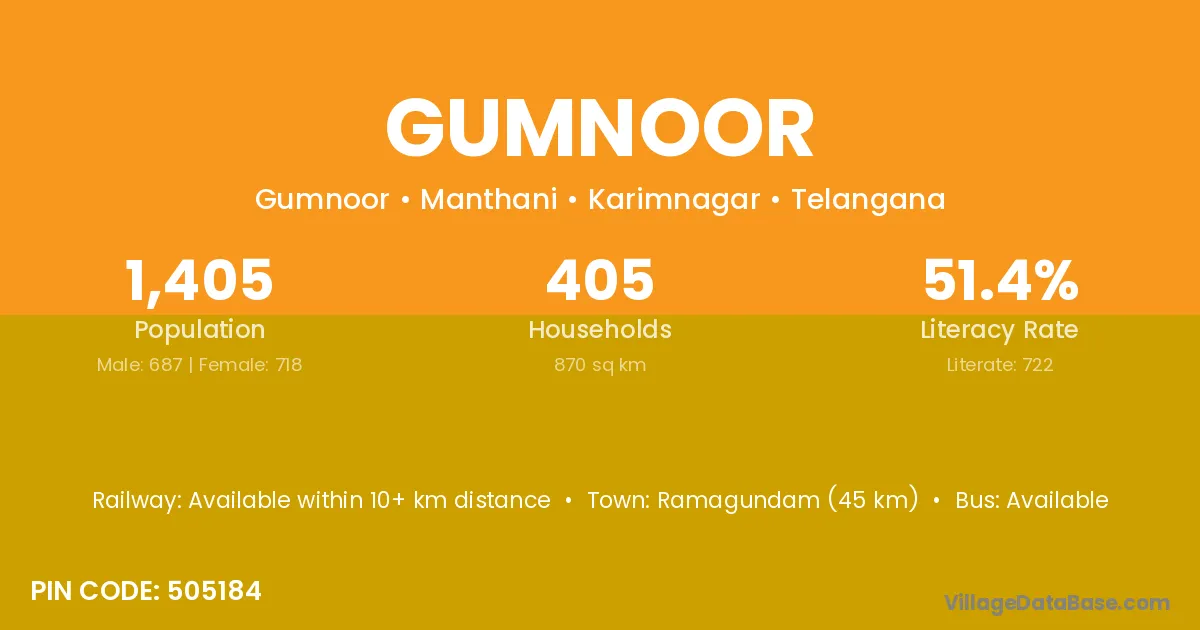 Ramagundam (45 km) is the nearest town to Gumnoor village for major economic activities and is located approximately 45 km away.