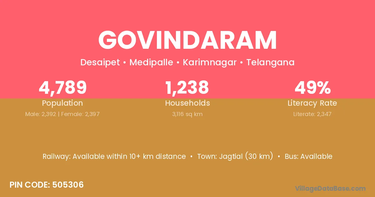 Jagtial (30 km) is the nearest town to Govindaram village for major economic activities and is located approximately 30 km away.