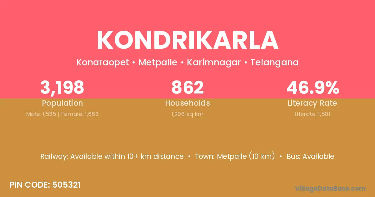 Kondrikarla village has a total population of 3,198 people, of which 1,535 are males and 1,663 are females.