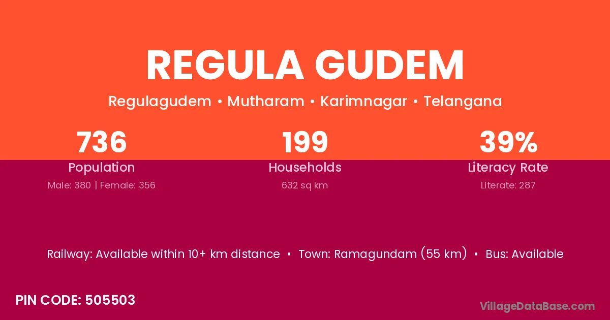 Ramagundam (55 km) is the nearest town to Regula Gudem village for major economic activities and is located approximately 55 km away.
