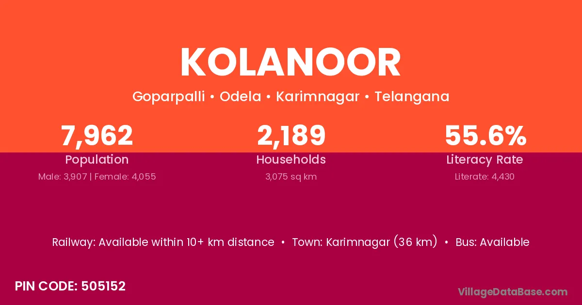 Karimnagar (36 km) is the nearest town to Kolanoor village for major economic activities and is located approximately 36 km away.