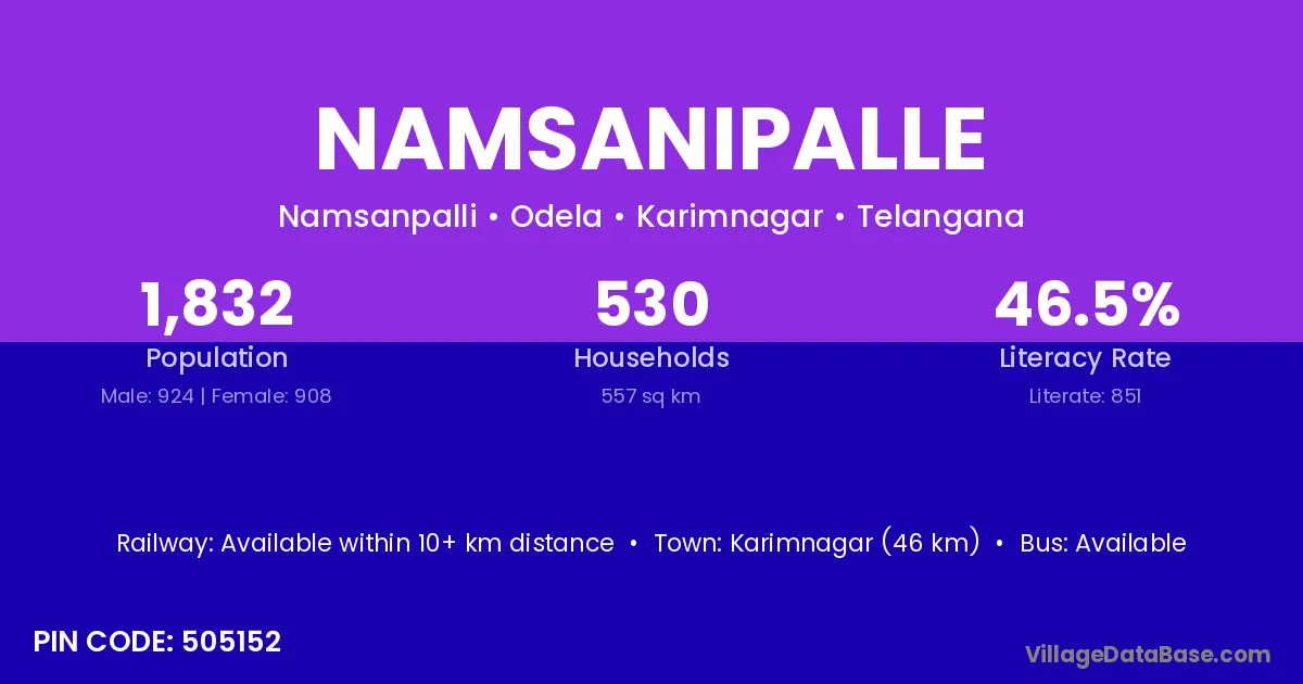 Karimnagar (46 km) is the nearest town to Namsanipalle village for major economic activities and is located approximately 46 km away.