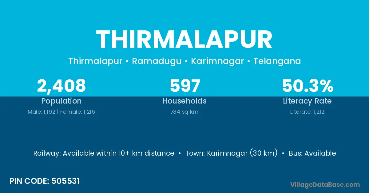 Karimnagar (30 km) is the nearest town to Thirmalapur village for major economic activities and is located approximately 30 km away.