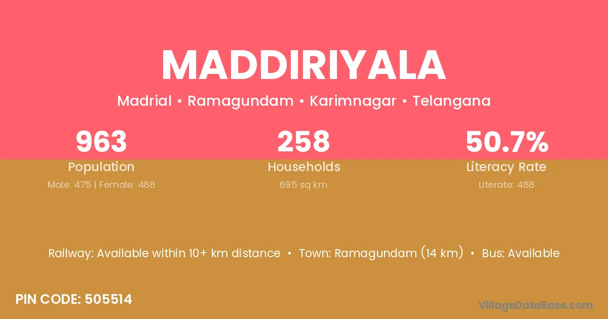 Ramagundam (14 km) is the nearest town to Maddiriyala village for major economic activities and is located approximately 14 km away.