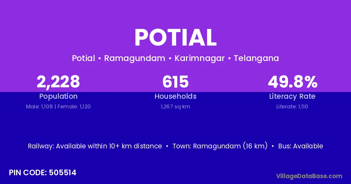 Ramagundam (16 km) is the nearest town to Potial village for major economic activities and is located approximately 16 km away.
