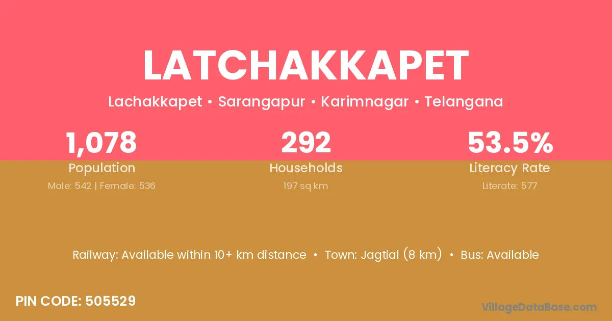 Jagtial (8 km) is the nearest town to Latchakkapet village for major economic activities and is located approximately 8 km away.