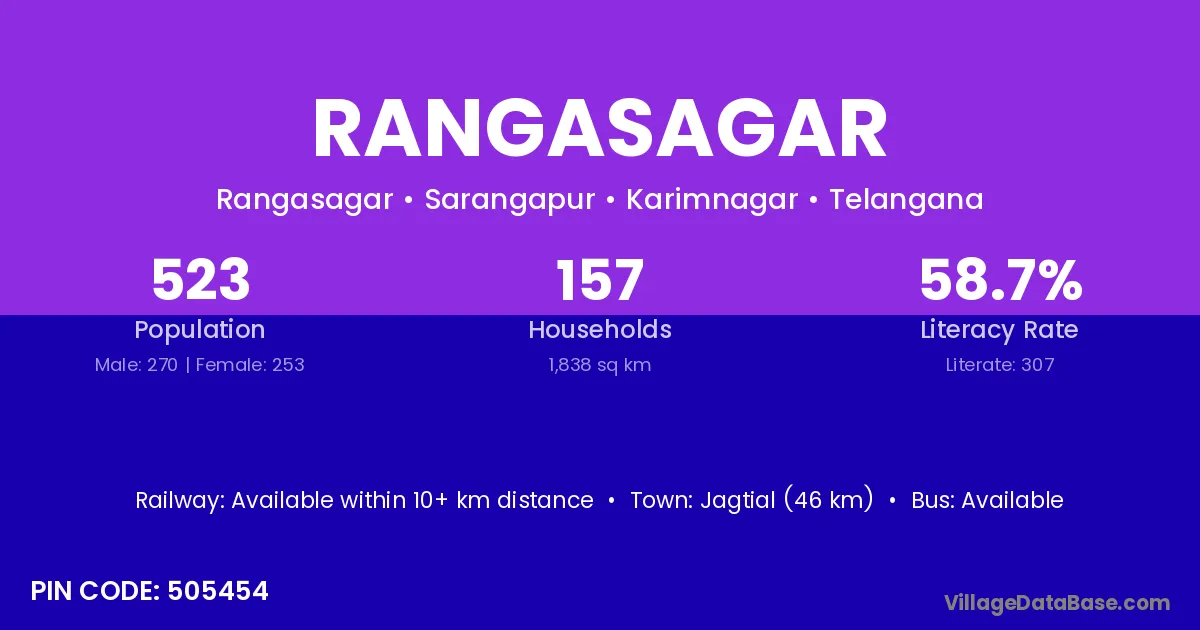 Jagtial (46 km) is the nearest town to Rangasagar village for major economic activities and is located approximately 46 km away.