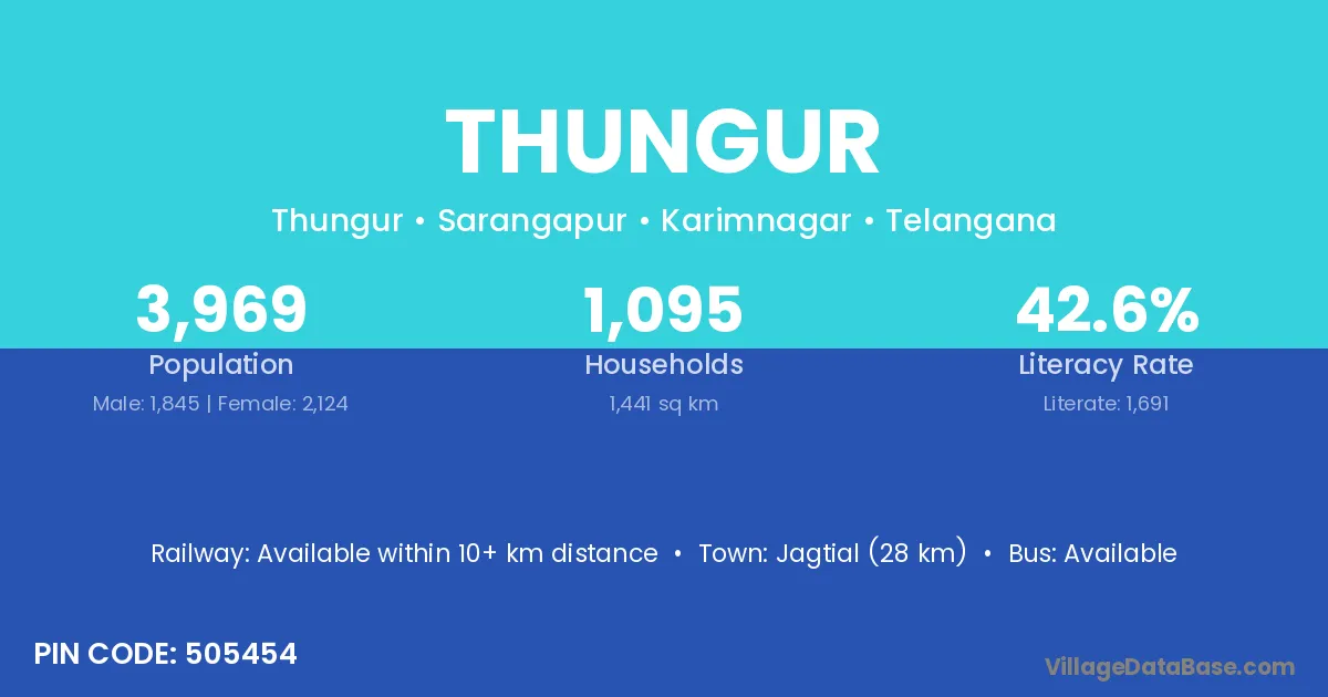 Jagtial (28 km) is the nearest town to Thungur village for major economic activities and is located approximately 28 km away.