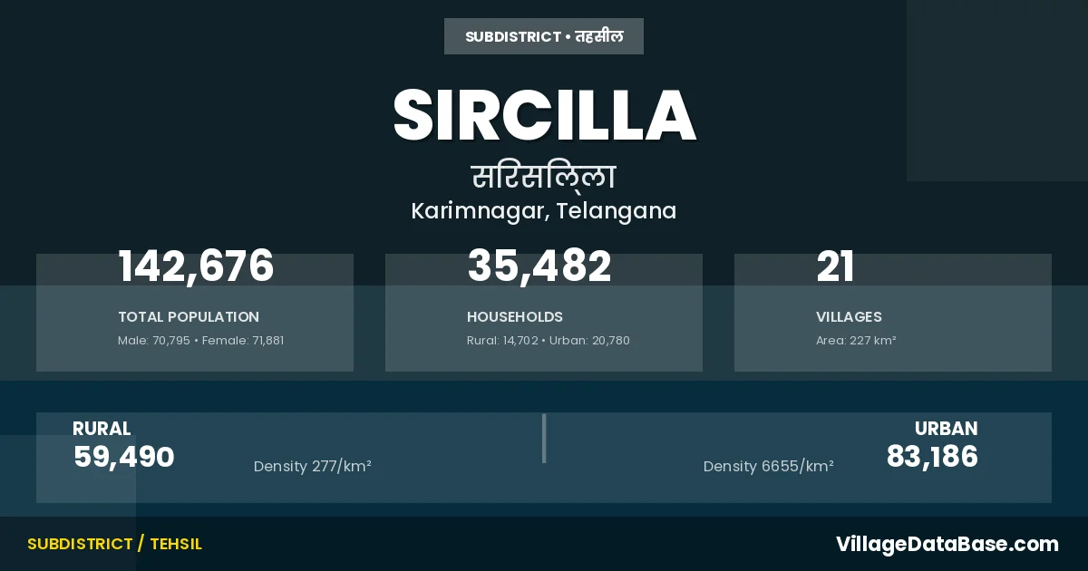According to the 2011 census The total area of Sircilla Mandal is 227 km², with a population of 142676 people. The population density is 628 inhabitants per square kilometre, and there are approximately 35482 houses in the sub district.