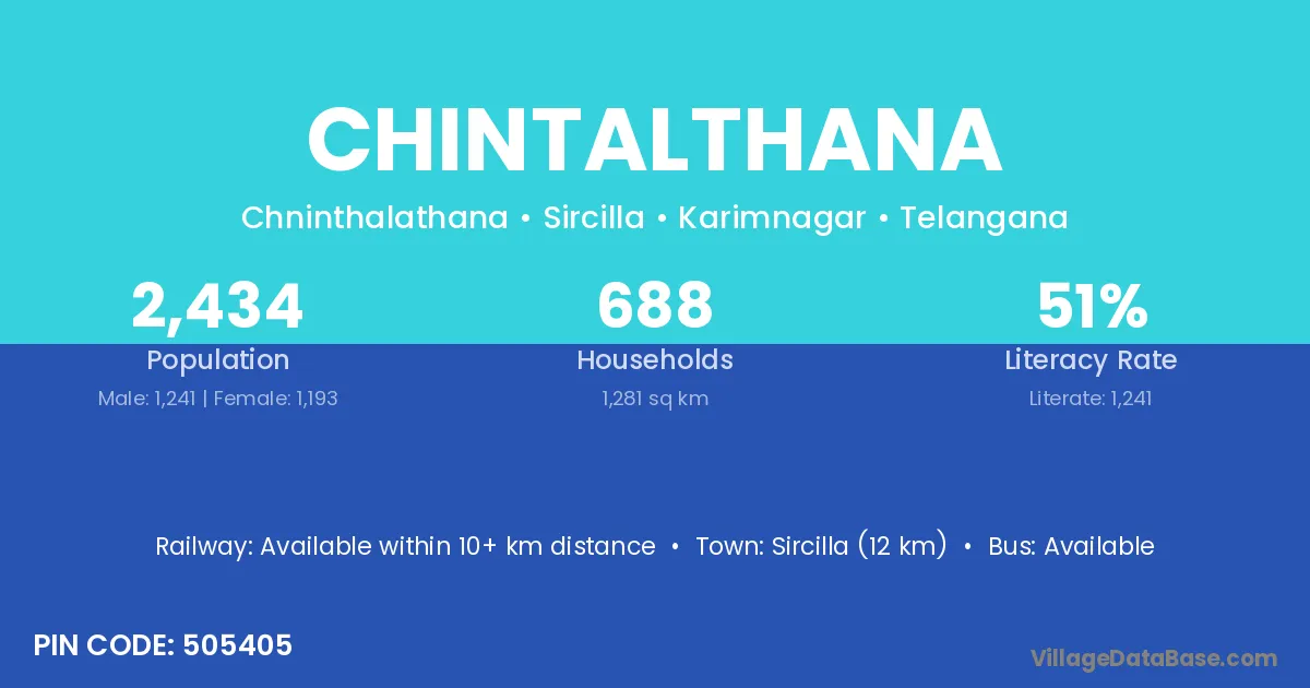 Sircilla (12 km) is the nearest town to Chintalthana village for major economic activities and is located approximately 12 km away.