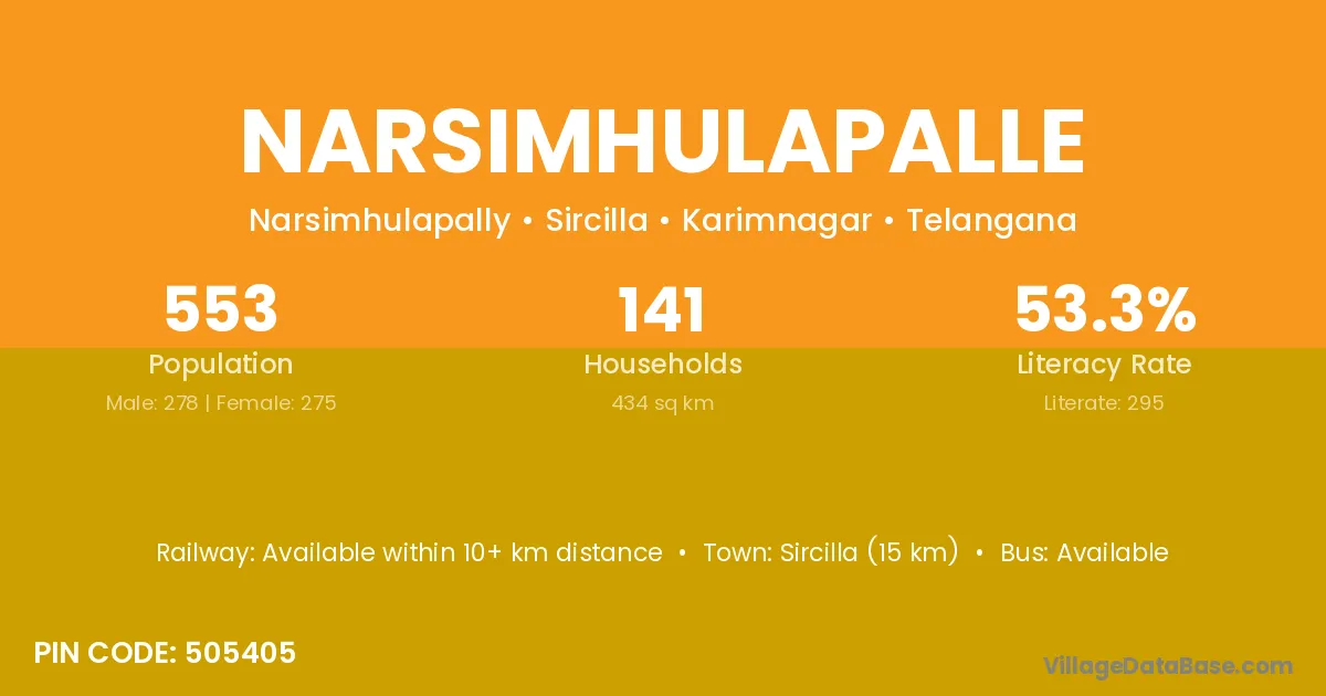 Sircilla (15 km) is the nearest town to Narsimhulapalle village for major economic activities and is located approximately 15 km away.