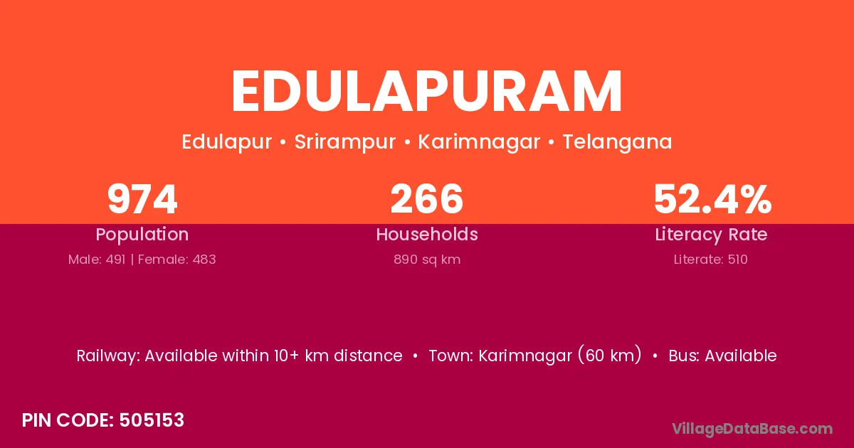 Karimnagar (60 km) is the nearest town to Edulapuram village for major economic activities and is located approximately 60 km away.