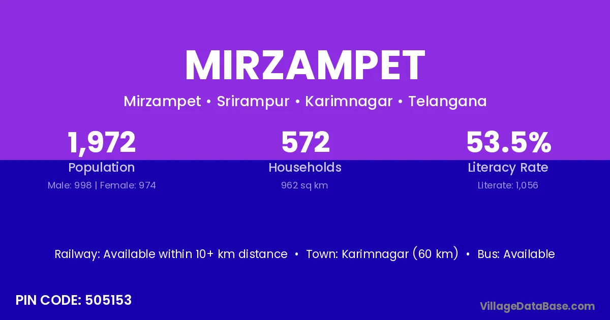 Karimnagar (60 km) is the nearest town to Mirzampet village for major economic activities and is located approximately 60 km away.