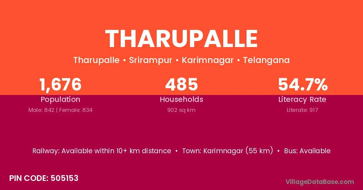 Karimnagar (55 km) is the nearest town to Tharupalle village for major economic activities and is located approximately 55 km away.