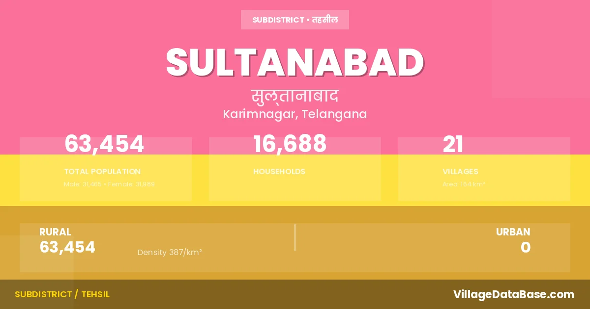 According to the 2011 census The total area of Sultanabad Mandal is 164 km², with a population of 63454 people. The population density is 387 inhabitants per square kilometre, and there are approximately 16688 houses in the sub district.