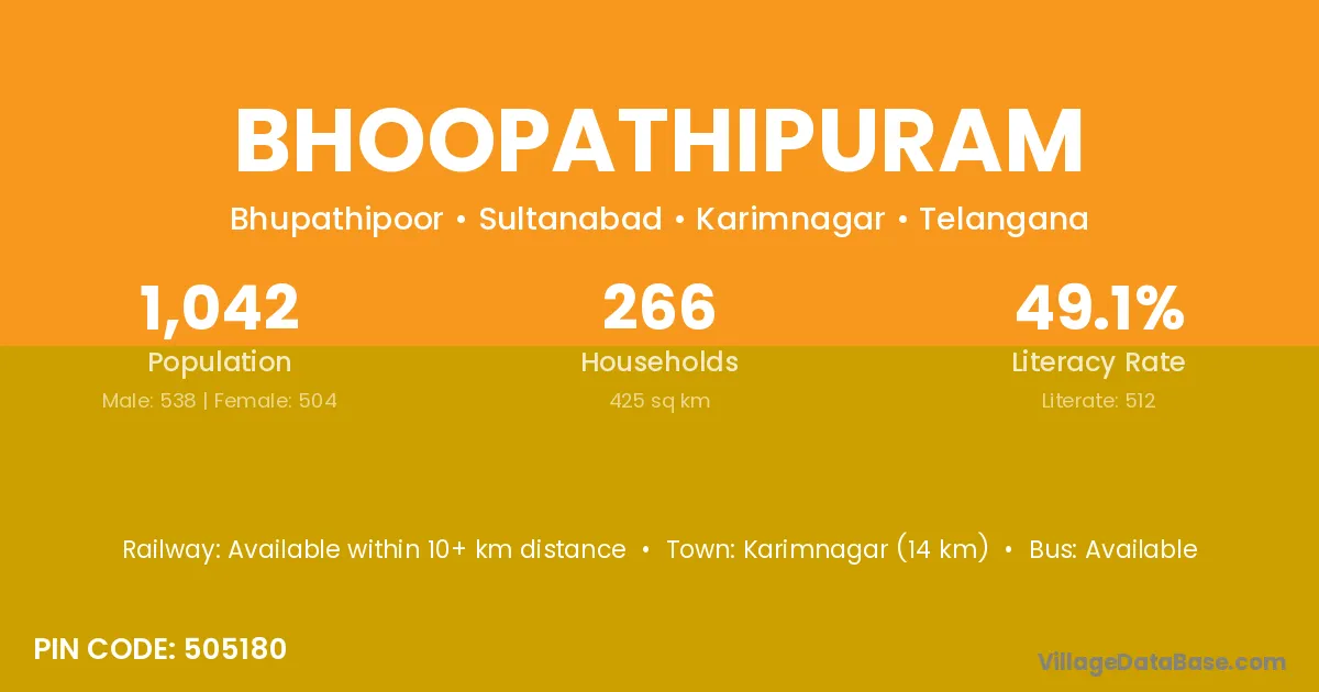 Bhoopathipuram village has a total population of 1,042 people, of which 538 are males and 504 are females.