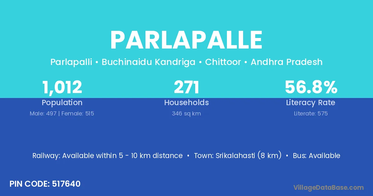 Parlapalle village has a total population of 3,870 people, of which 1,882 are males and 1,988 are females.