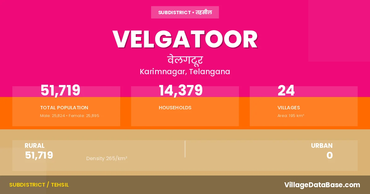 According to the 2011 census The total area of Velgatoor Mandal is 195 km², with a population of 51719 people. The population density is 265 inhabitants per square kilometre, and there are approximately 14379 houses in the sub district.