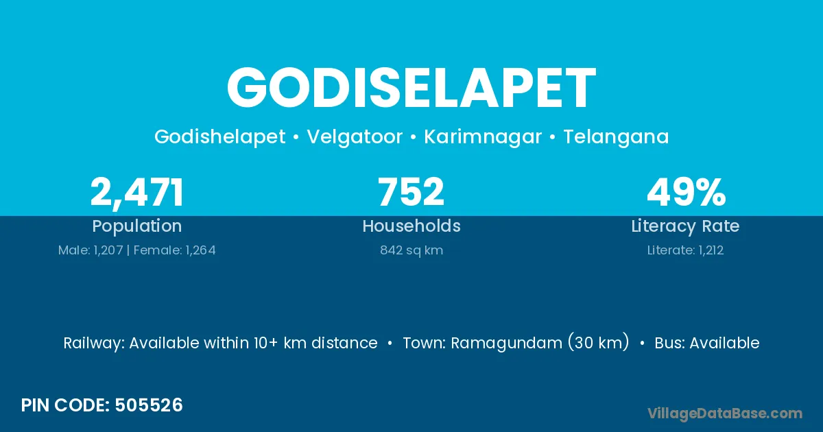 Ramagundam (30 km) is the nearest town to Godiselapet village for major economic activities and is located approximately 30 km away.