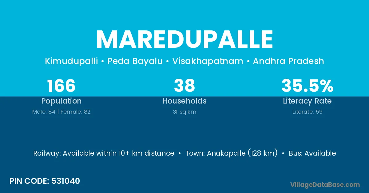The literacy rate of Maredupalle village is 50.78%. Male literacy stands at 58.45% and female literacy at 43.22%.