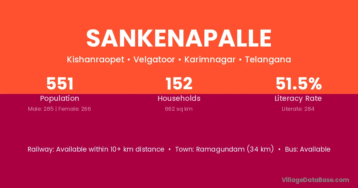 Ramagundam (34 km) is the nearest town to Sankenapalle village for major economic activities and is located approximately 34 km away.