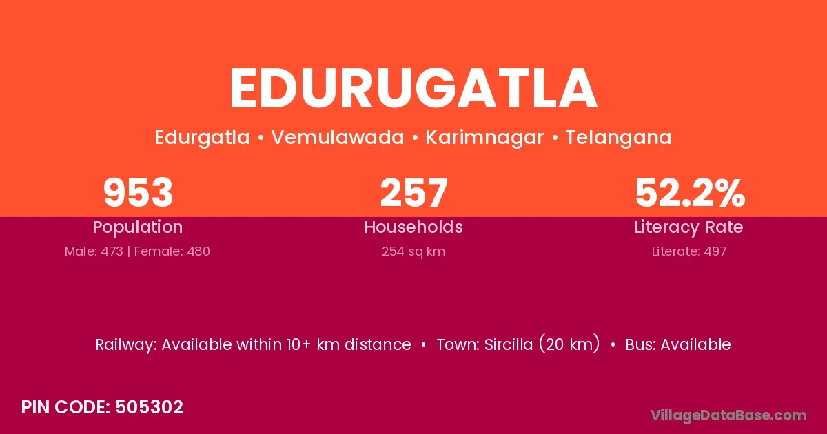 Sircilla (20 km) is the nearest town to Edurugatla village for major economic activities and is located approximately 20 km away.