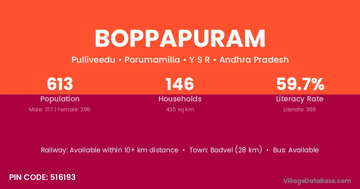 The literacy rate of Boppapuram village is 56.86%. Male literacy stands at 66.47% and female literacy at 46.98%.
